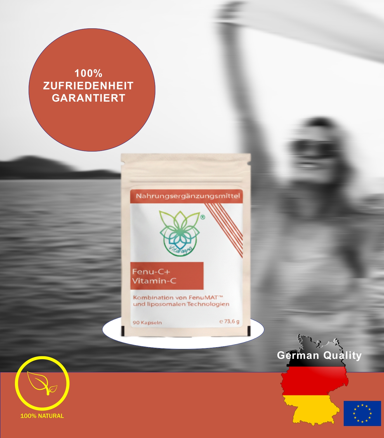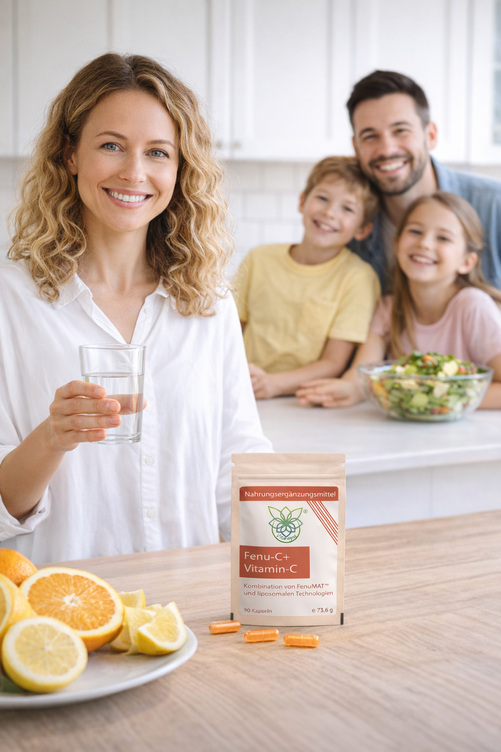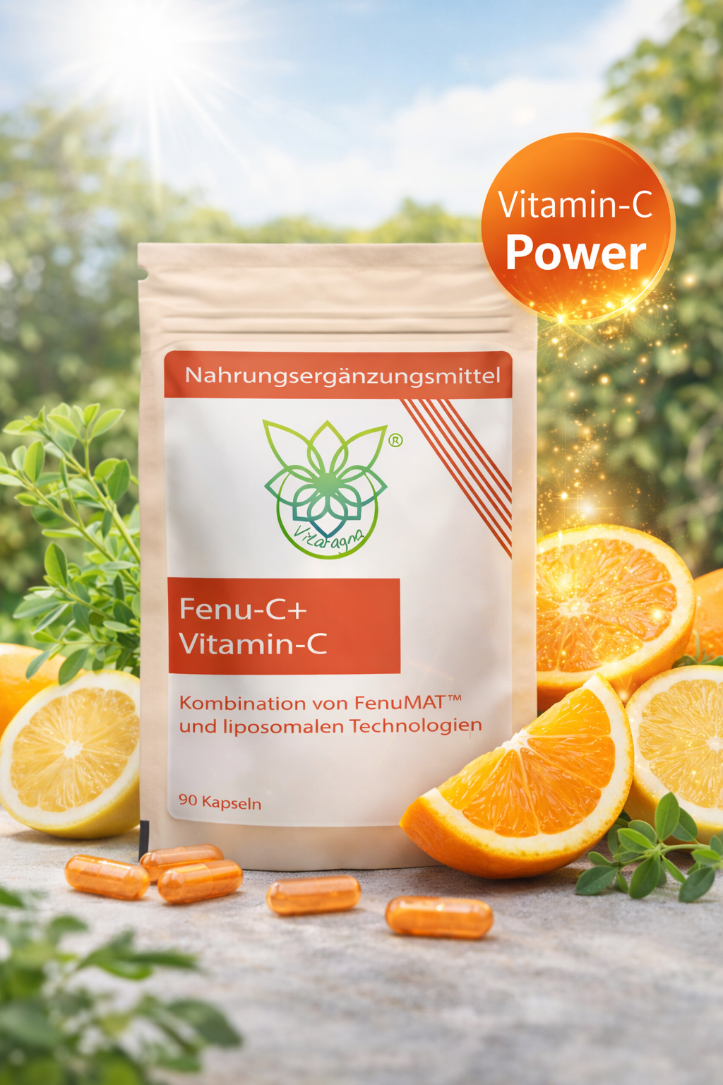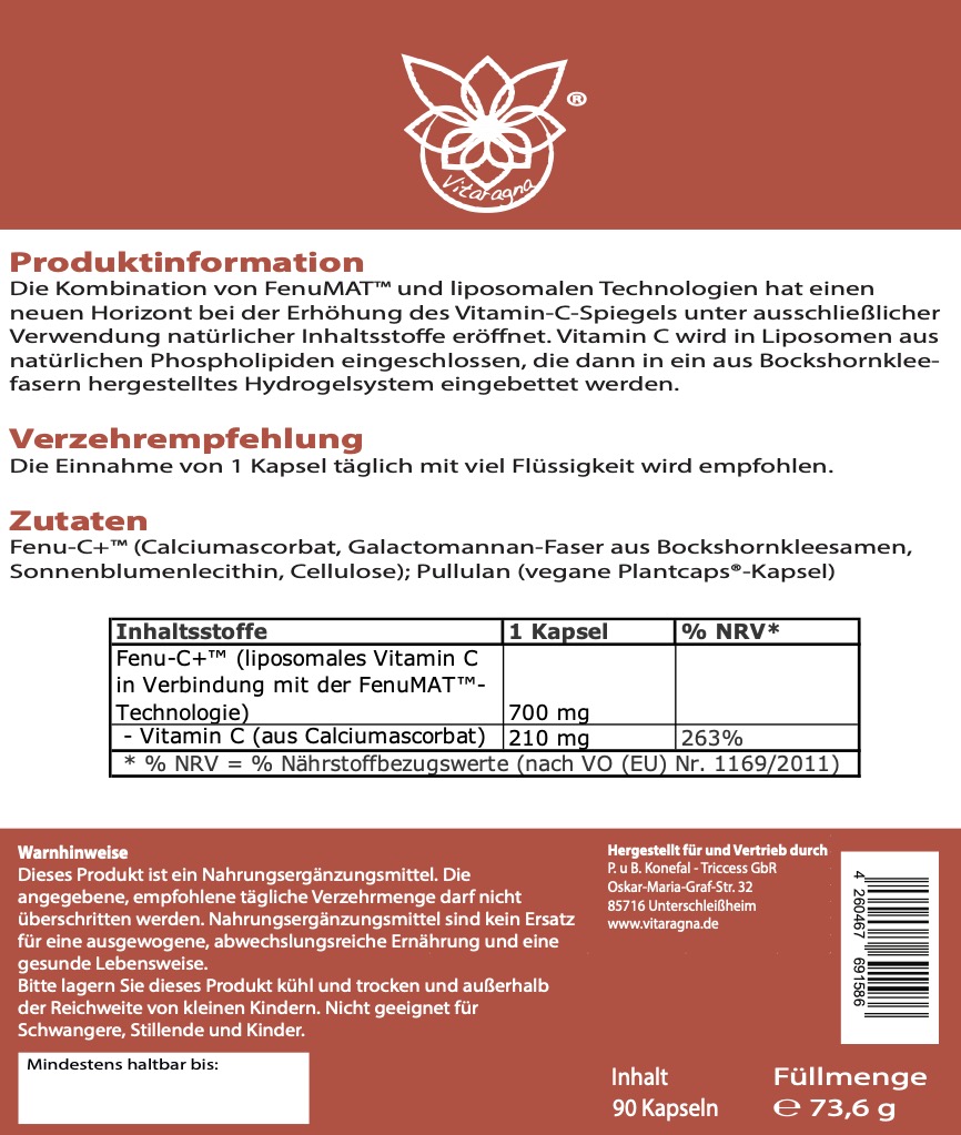 Das Ergebnis ist ein Produkt, das den Vitamin-C-Spiegel im Körper kontinuierlich hochhält und dabei eine höhere Verwertung als herkömmliches Vitamin C ermöglicht. Eine einmalige Einnahme von nur 360 mg Fenu-C+ hebt den Vitamin-C-Spiegel stärker an als eine Gabe von herkömmlichem Vitamin C. Dabei enthält Fenu-C+ ausschließlich natürliche Inhaltsstoffe wie Phospholipide aus Sonnenblumenlecithin und Fasern aus Bockshornklee.