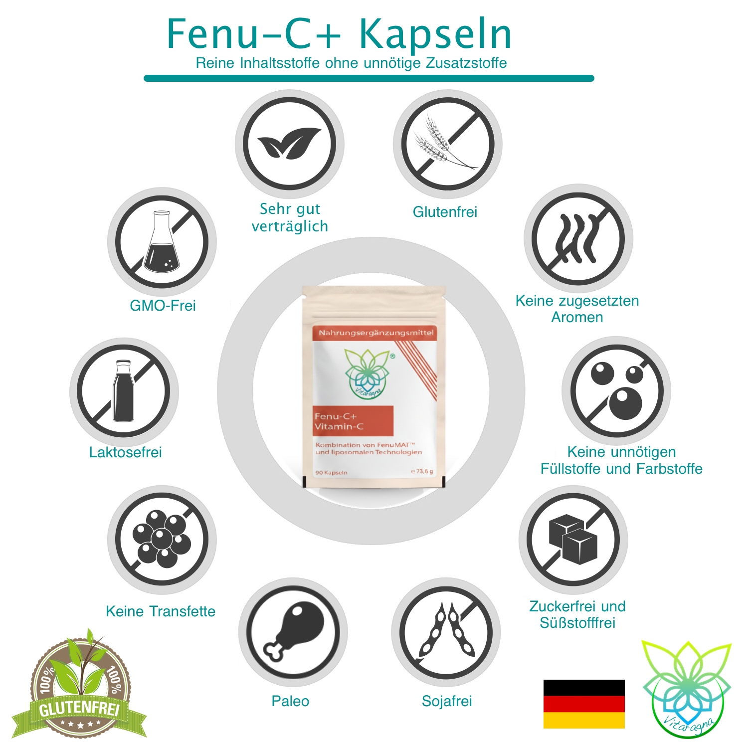 Fenu-C+TM (Calciumascorbat, Galaktomannanfaser aus Bockshornkleesamen, Sonnenblumenlecithin, Cellulose), Kapselhülle (Gelatine)
