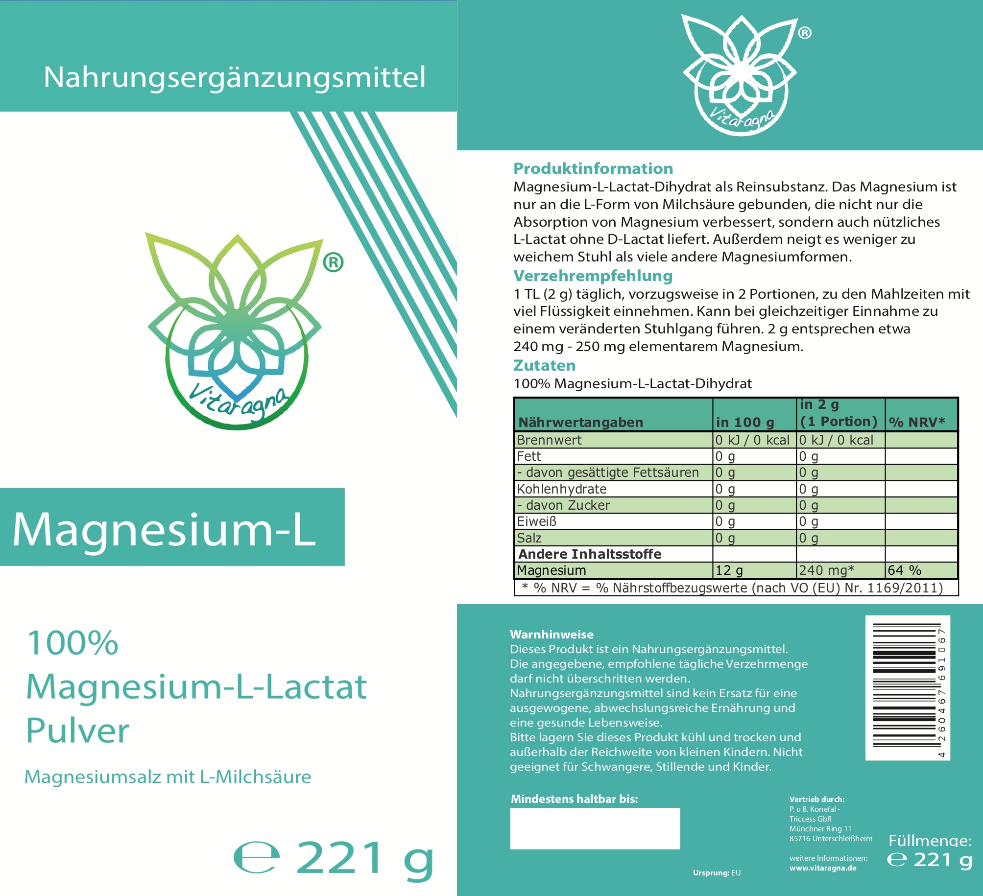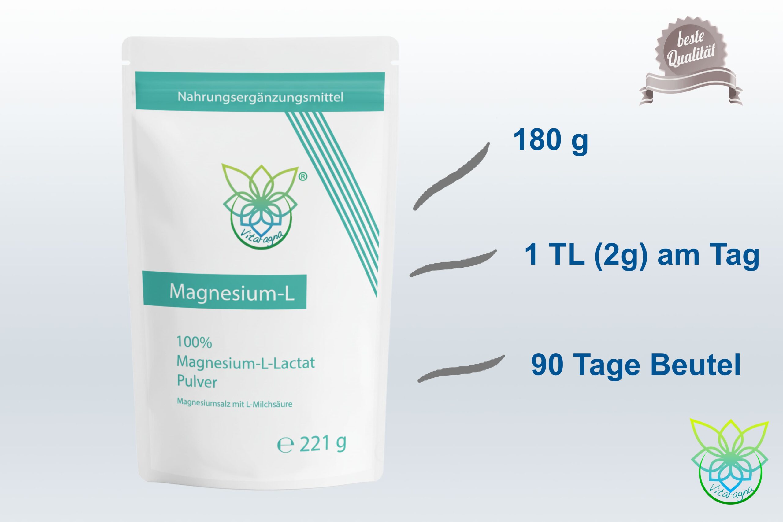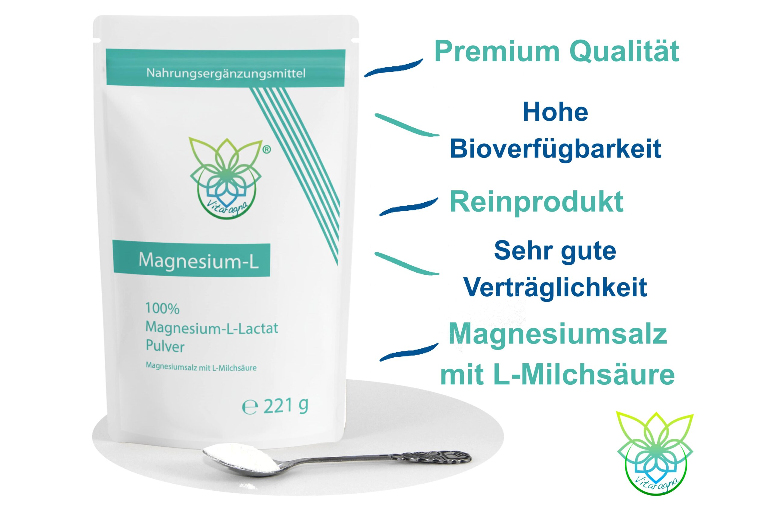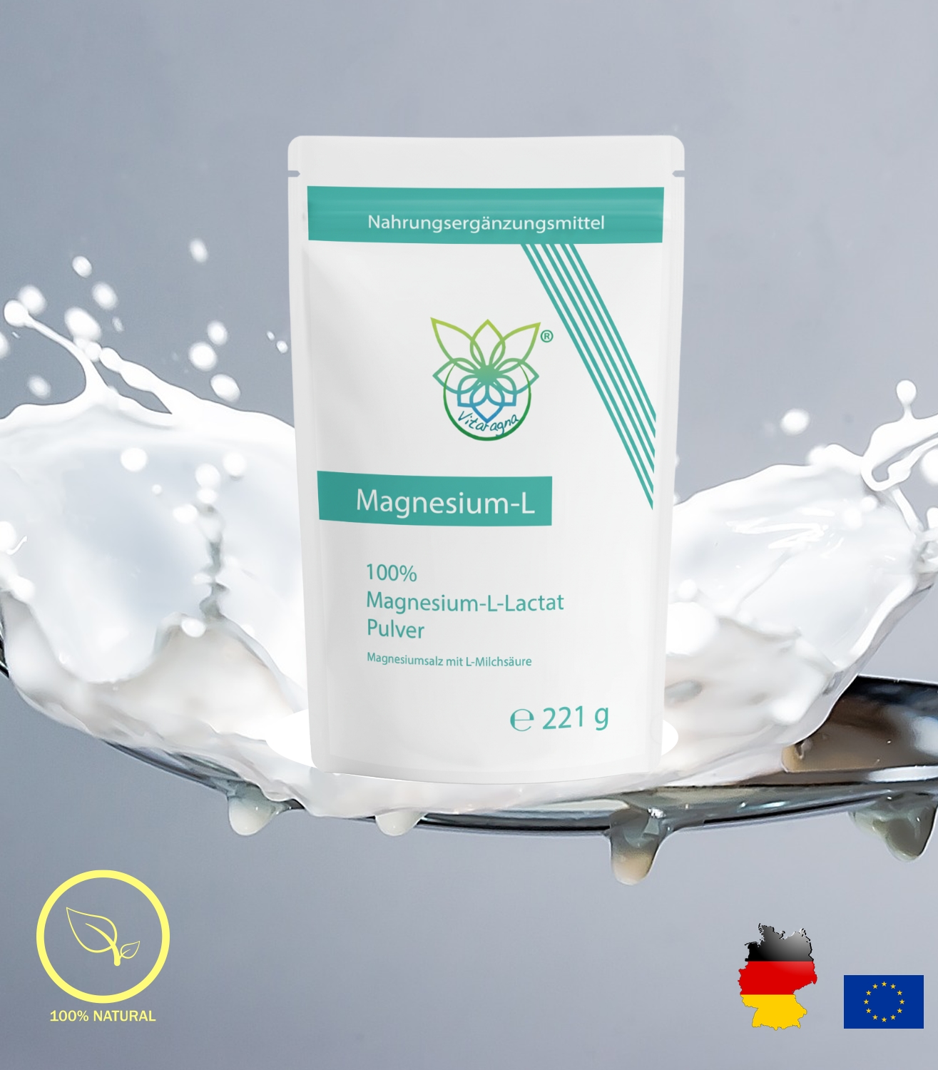 Reine Inhaltsstoffe: Magnesium L-Lactat Pulver ohne Zusätze, geschmacksneutral.