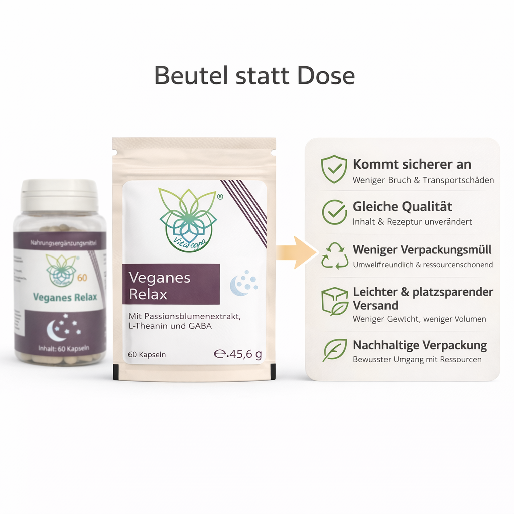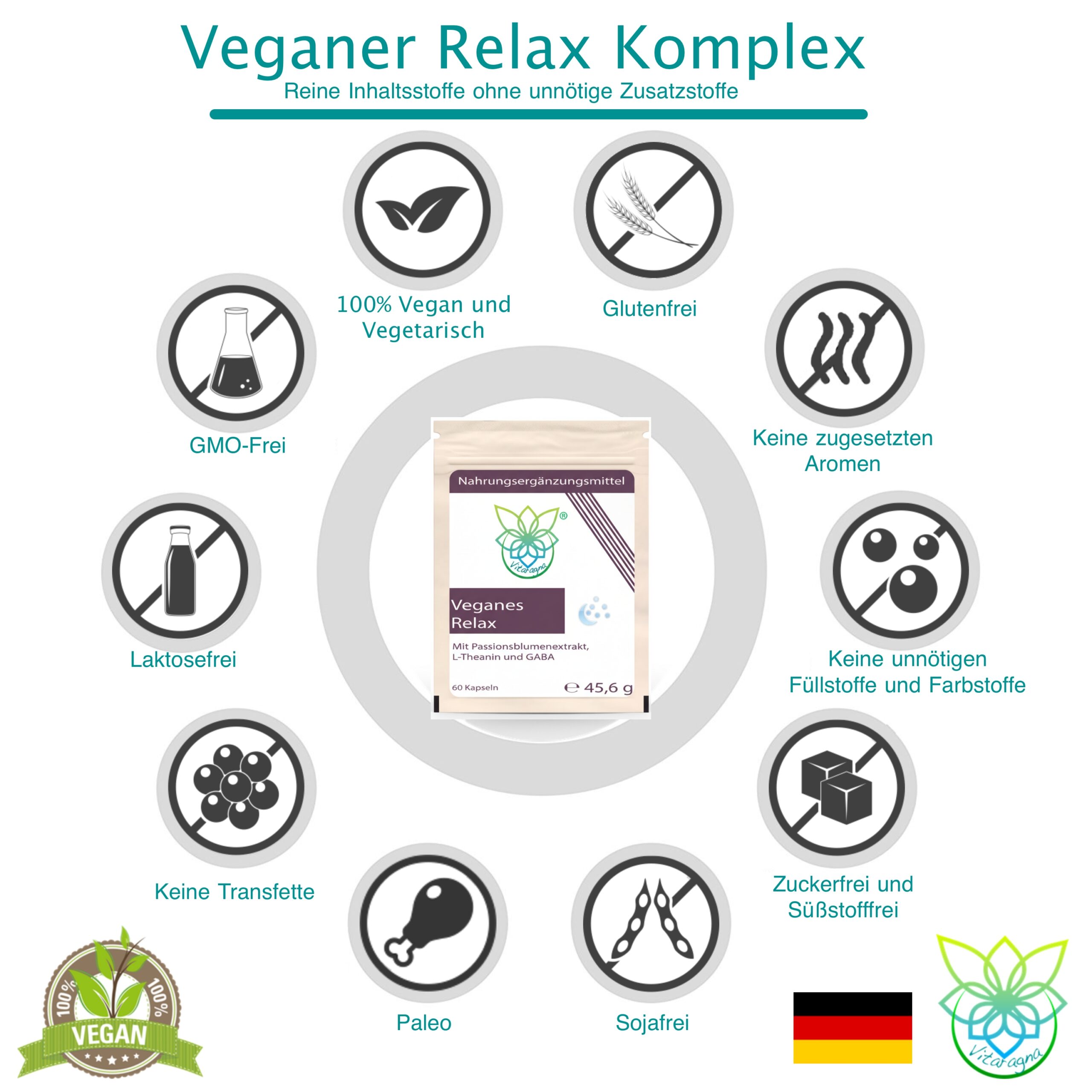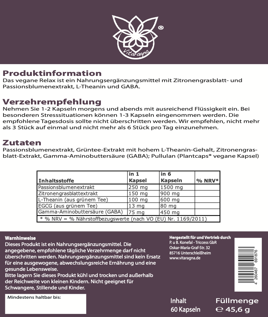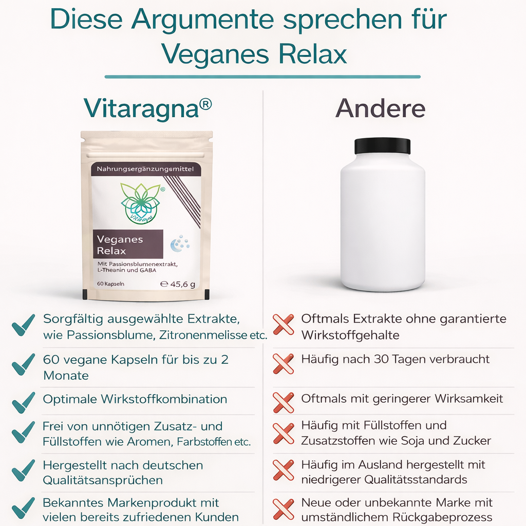 Frei von künstlichen Zusatzstoffen und vollständig vegan, eignet sich VITARAGNA Relax perfekt für Menschen, die ein Produkt mit geprüfter Qualität suchen.